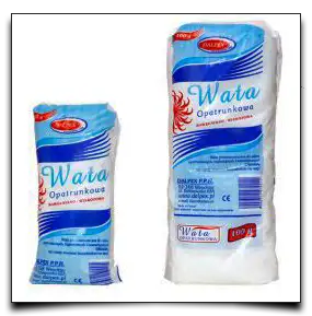 4. Wata opatrunkowa, która zwykle stanowi połączenie waty bawełnianej z ligniną, dzięki czemu opatrunek jest skuteczniejszy w tamowaniu krwawienia lub wysięku. Może mieć formę jałową, kiedy pojedynczy opatrunek zamknięty jest w szczelnym opakowaniu, lub niejałową, gdy cały produkt znajduje się w jednym worku. Opatrunki jałowe przykłada się do ran, niejałowa wata służy przede wszystkim do przemywania okolic urazu.