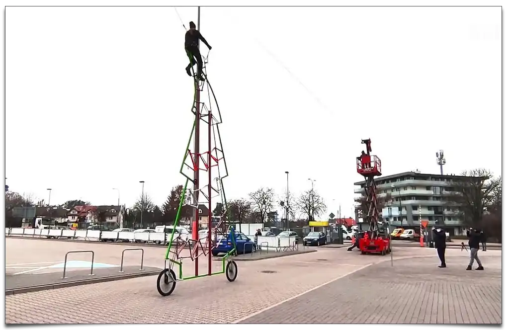 Na tym dziwacznym pojeździe, Pan Adam w przebraniu Świętego Mikołaja przejechał ponad 100 metrów pomiędzy dwoma podnośnikami.